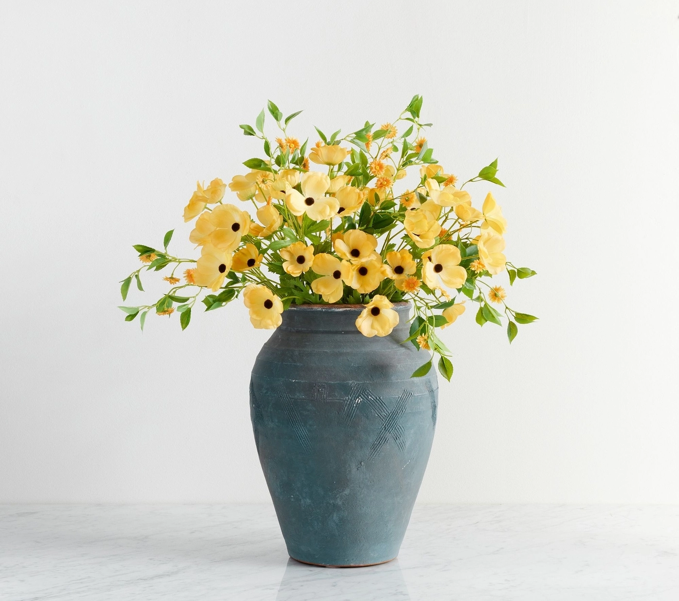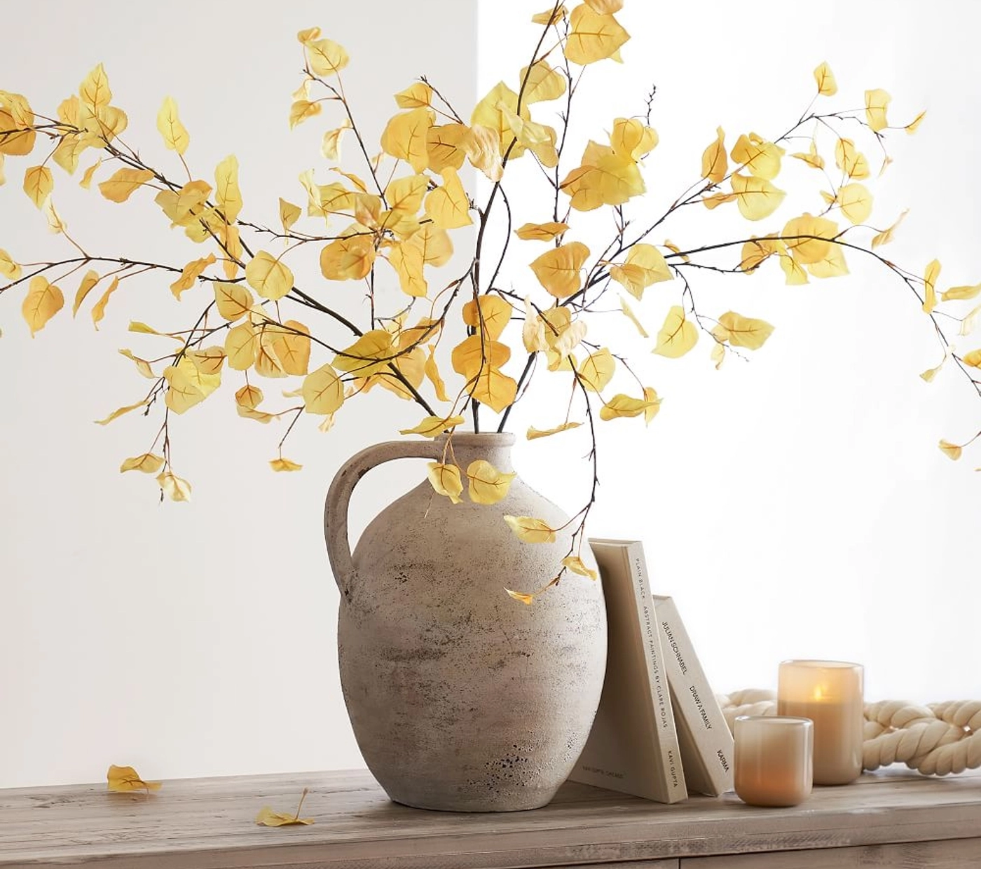 Potterybarn's Faux Yellow Butterfly Ranunculus Bundle arranged in their Indigo Artisan Handcrafted Vase, Potterybarn's Faux Green Petal Leaf Branch (for vase recommendation please read below), Potterybarn's Faux Autumn Aspen Tree Branch arranged in their Weathered Handcrafted Natural Vase.
